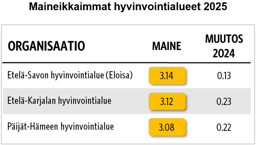 Maineeltaan parhaaksi hyvinvointialueeksi kiri tänäkin vuonna Etelä-Savon hyvinvointialue Eloisa. Eloisa oli maineeltaan paras hyvinvointialue myös vuonna 2024. Luottamus&Maine -tutkimus selvitti jälleen alueiden mainetta näiden asukkailta.