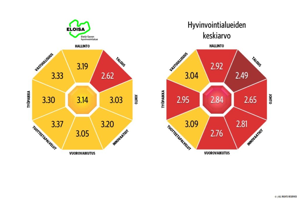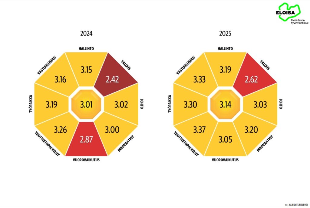 Näistä kohtalaiseen tulokseen Eloisa ylsi kaikissa muissa paitsi taloudessa, jossa tulos jäi heikoksi, mutta siinäkin oli nousua vuoden takaiseen verrattuna. Eloisan pistekertymä on kehittynyt positiiviseen suuntaan kaikilla maineen eri osa-alueilla.
